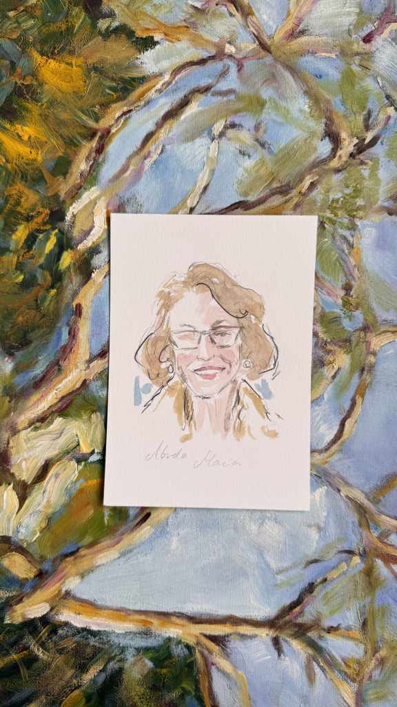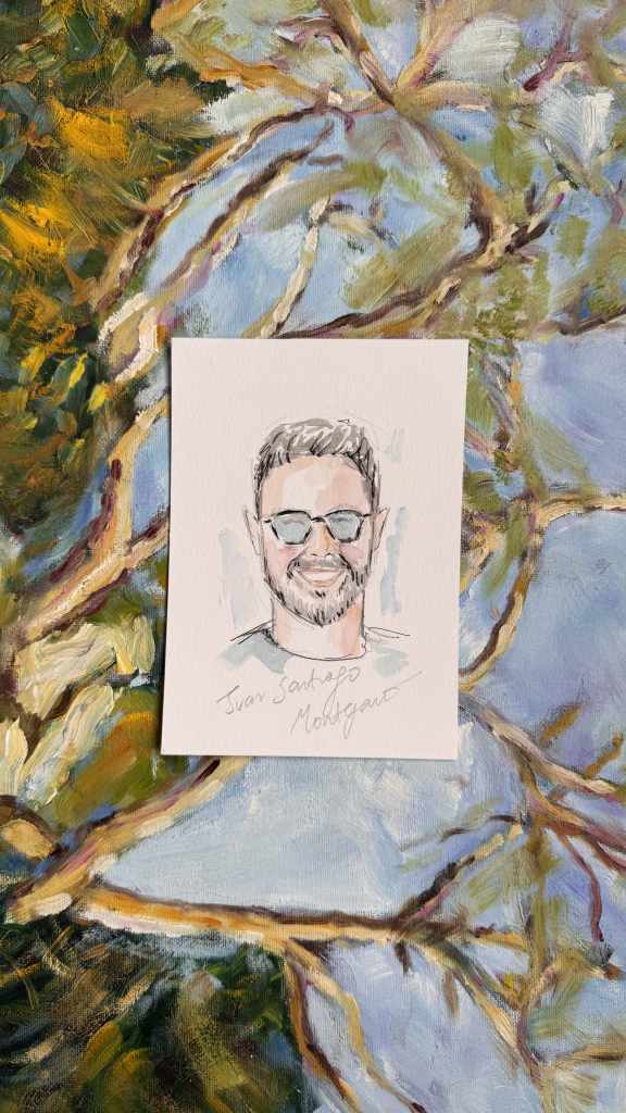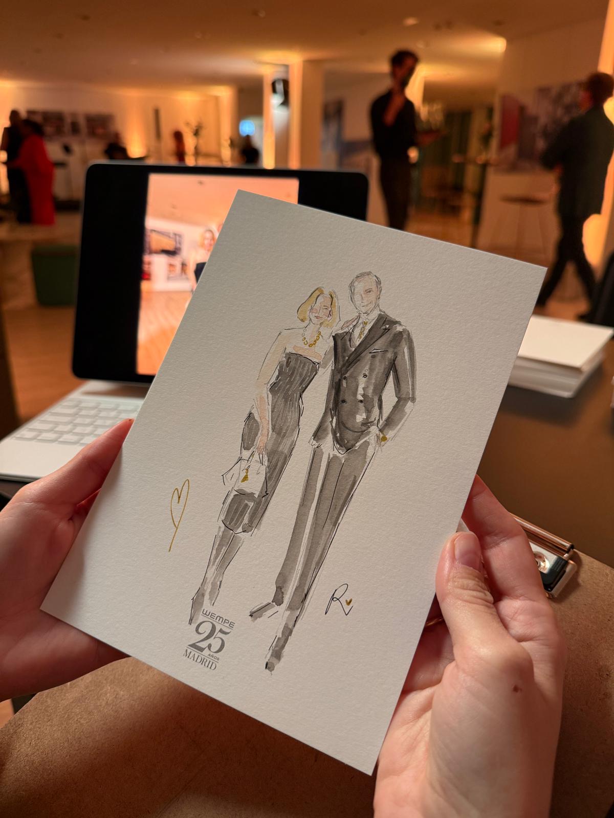 Con mi experiencia en dibujo en directo, he perfeccionado un enfoque altamente efectivo que permite realizar retratos de manera ágil, evitando largas esperas y momentos de posado. Yo les animo a hacerse una foto, y así poderles ilustrar mientras vuelven al cocktail o al banquete, y más tarde pueden venir a recogerlos. Esto garantiza que los invitados puedan seguir disfrutando del evento, sin interrupciones, mientras yo me encargo de capturar su esencia en el retrato.