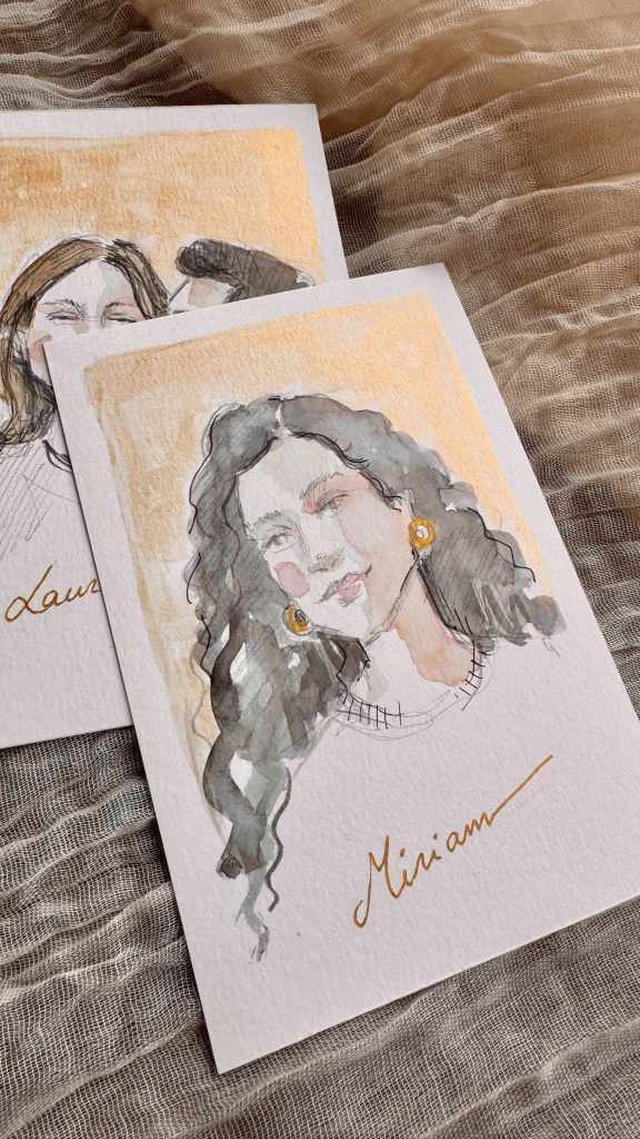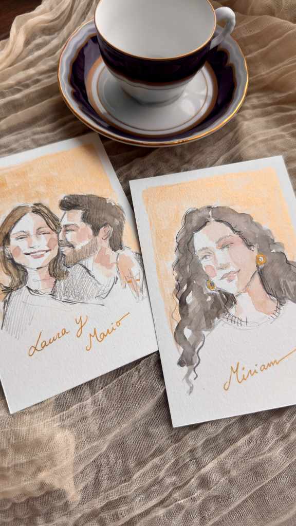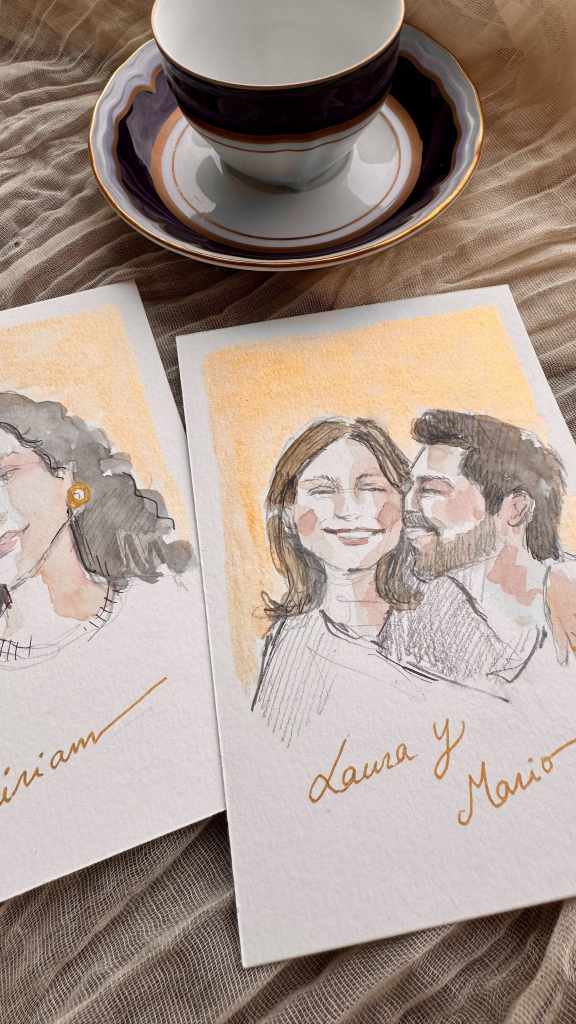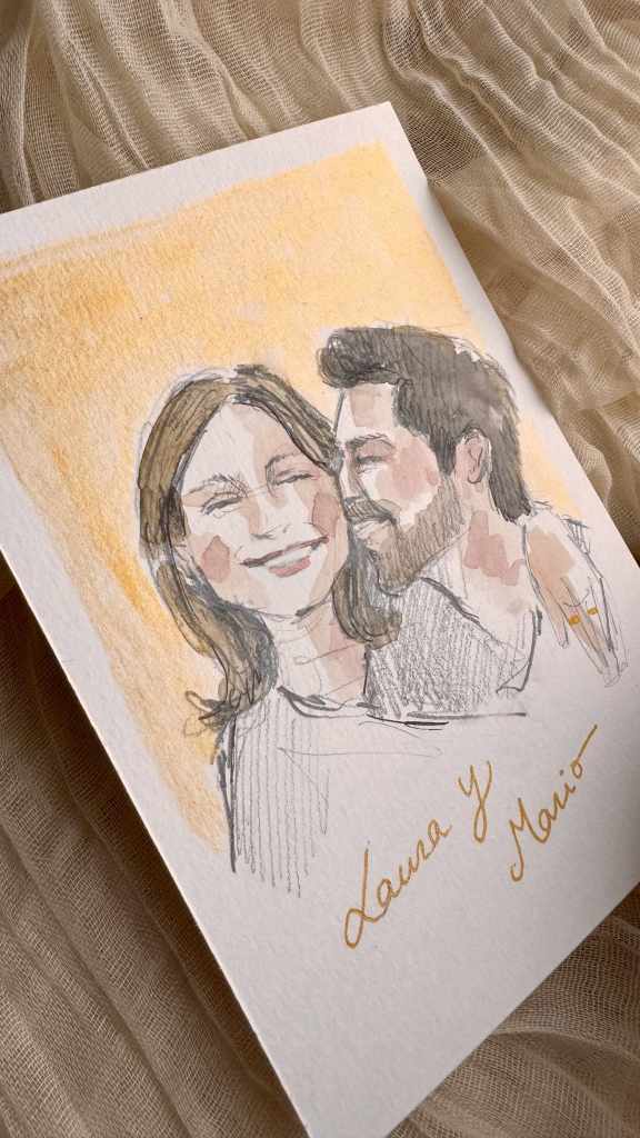 También damos la opción de realizar ilustraciones en lápiz y acuarela para regalar individualmente a quien queráis. Desde testigos, vuestros padres, mejores amigos, parejas que se van a casar…Cualquier idea que tengáis podemos llevarla a cabo. Puedes ver más ejemplos en mi cuenta de IG @raquelzquin.design